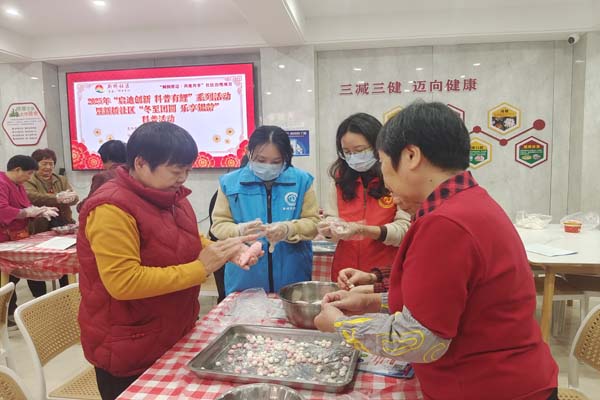 冬至搓圆,寓意团圆美满。在政策宣讲结束后,“搓冬至圆,做艾草锤”环节正式拉开帷幕!工作人员和社工提前备好了糯米粉、艾草和绳索等材料,邀请居民一同动手体验传统民俗。