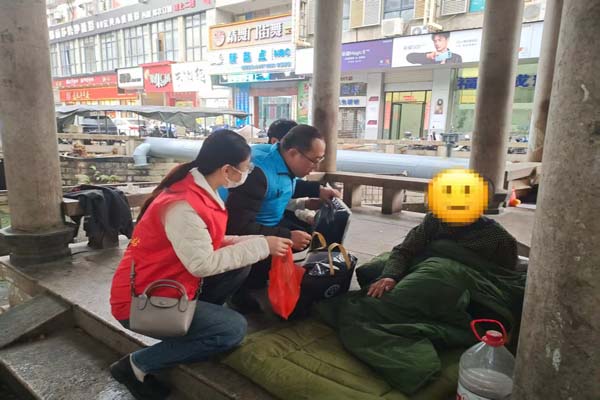 在涂门街八角亭,众人发现一名52岁的永春籍流浪人员,其无固定收入来源,行动困难。工作人员立即从随身携带的暖冬包中取出保温盒,主动喂食汤圆。考虑到其身体状况,依据“先救治、后救助”的原则,工作人员第一时间联系医院,将其送医诊治。
